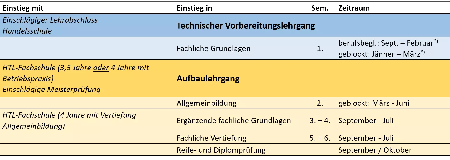 BewerberInnen mit einer facheinschlägigen Meisterprüfung können die Ausbildung im Aufbaulehrgang starten. Hierfür ist der Besuch eines Allgemeinbildungssemesters notwendig.