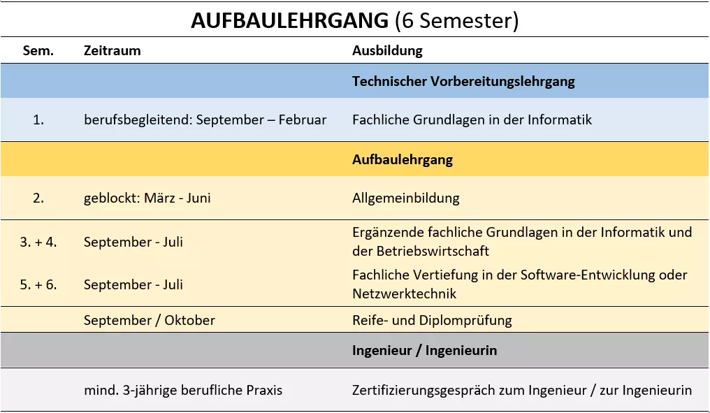 BewerberInnen mit einem facheinschlägigen Lehrabschluss, z.B. Lehre für Informationstechnologie, können die Ausbildung im Aufbaulehrgang starten. Vor der eigentlichen Ausbildung sind die Besuche eines technischen Vorbereitungslehrgangs und eines Allgemeinbildungssemesters notwendig.